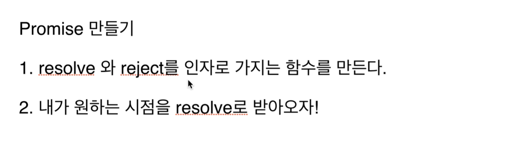 Promise 객체는 new 키워드와 생성자를 사용해 만든다. 생성자는 매개변수로 두 가지 실행함수를 받아야 하는데, 첫 번째 함수(resolve)는 비동기 작업을 성공적으로 완료해 결과를 값으로 반환할 때 호출하고, 두 번째 함수(reject)는 작업이 실패하여 오류 원인을 반환 시 호출한다. 두 번째 함수는 주로 오류 객체를 받는다.