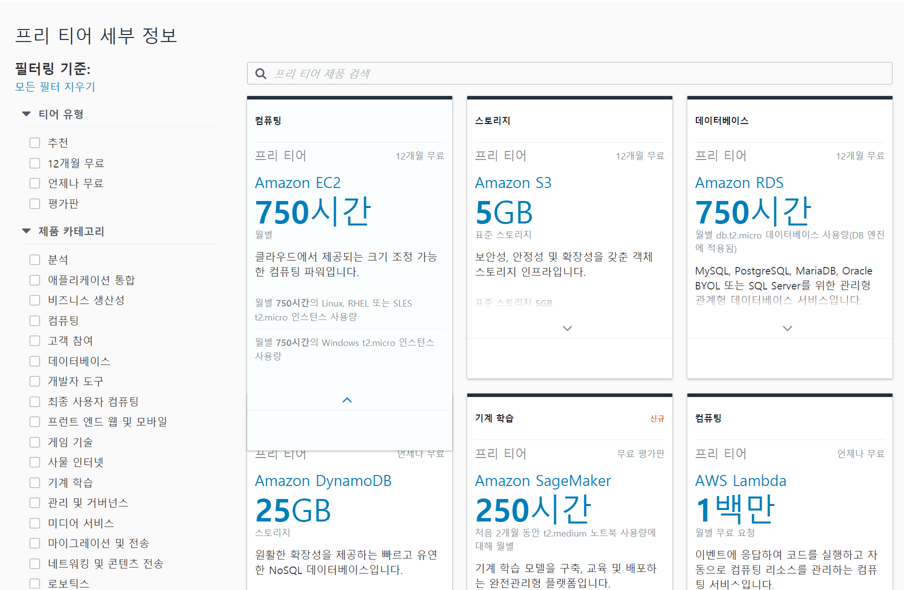 프리 티어 계정은 아래와 같은 무료 혜택이 주어진다. ( 요금표 보기 )
