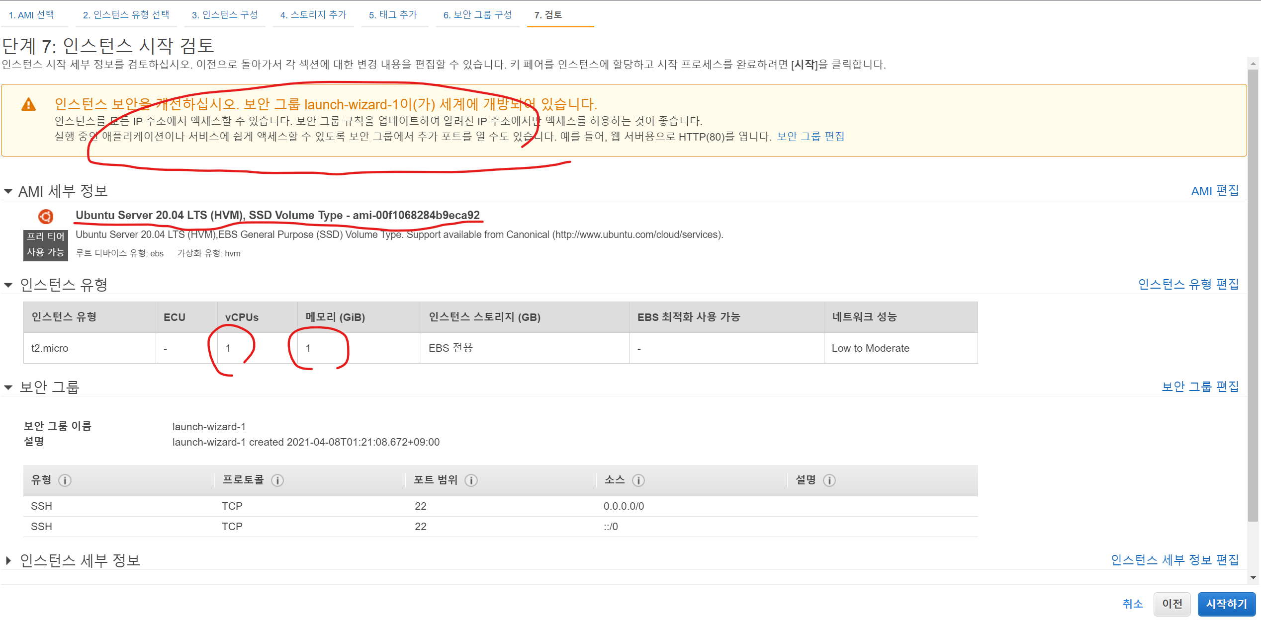 자신이 선택한 인스턴스 및 각종 설정들이 맞는지 최종 검토하는 페이지이다. 이전 단계인 보안그룹 설정에서 어떤 IP에서도 모두 접속이 가능하도록 설정해뒀더니, 인스턴스 보안을 개선하라는 경고 문구가 출력되어 있는 것을 볼 수 있다. 테스트 서버이므로 일단 무시하고 진행하자.